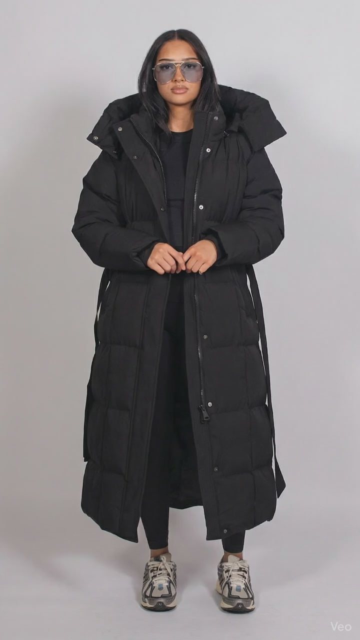 Este abrigo acolchado largo ofrece máxima protección y estilo para los días más fríos del invierno. Su silueta extendida proporciona una cobertura total, mientras que el diseño acolchado mantiene una estética moderna y limpia. La capucha grande añade funcionalidad y un toque envolvente que protege del viento y las bajas temperaturas, ideal para un uso diario tanto en ciudad como en exteriores.