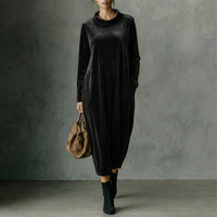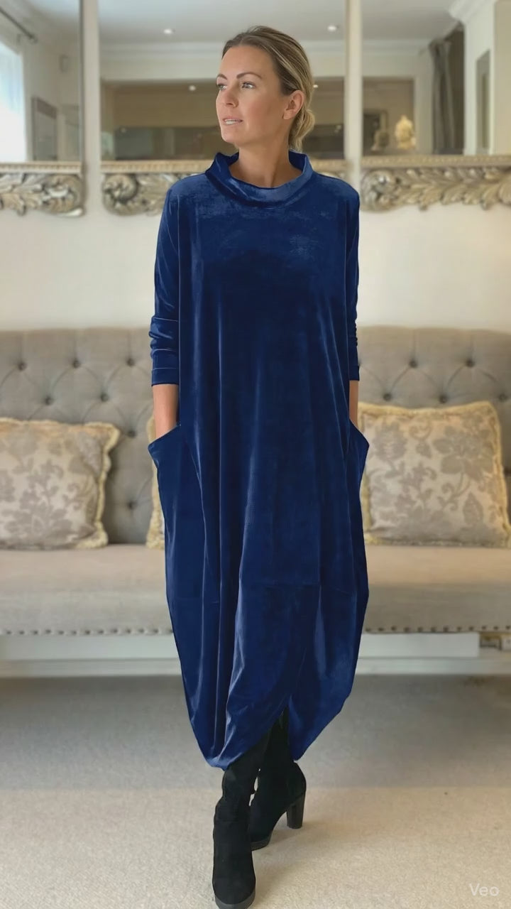 Este vestido largo en terciopelo profundo destaca por su silueta fluida y su caída elegante, pensada para ofrecer comodidad sin renunciar al estilo. El diseño amplio envuelve el cuerpo con suavidad, creando un efecto sofisticado y relajado a la vez. Su cuello ligeramente elevado aporta un toque refinado que equilibra perfectamente el conjunto.