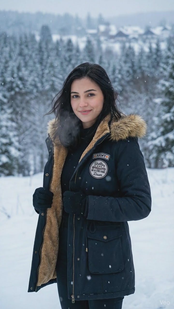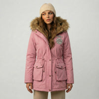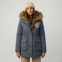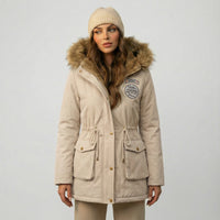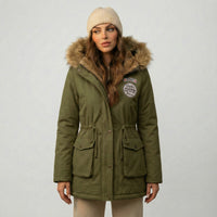 La capucha con borde de pelo sintético añade un toque de lujo y calidez, creando un marco elegante alrededor del rostro y protegiendo eficazmente del viento y el frío. El cuello alto y el cierre de cremallera completan un diseño pensado para maximizar la sensación de abrigo sin perder la estética urbana y sofisticada.
