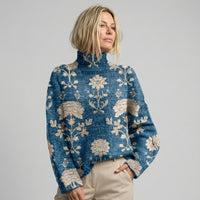 El tejido suave ofrece una sensación agradable al contacto con la piel, mientras que el cuello alto aporta abrigo adicional para los días fríos. Su corte relajado permite libertad de movimiento y un ajuste cómodo, perfecto para looks casuales o para dar un toque especial a un outfit básico. Cada detalle del estampado está cuidadosamente trabajado para crear una pieza armoniosa, cálida y visualmente cautivadora.