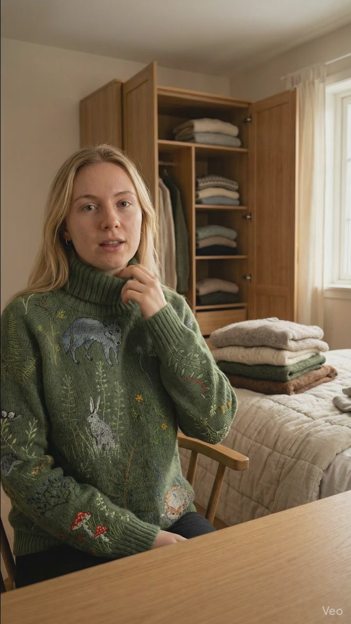 Este jersey verde de inspiración forestal combina calidez, encanto y un estilo único lleno de personalidad. Su diseño presenta ilustraciones detalladas de animales del bosque, como zorros, conejos y aves, acompañadas de plantas, flores y hongos que evocan un ambiente mágico y natural. Es una prenda que destaca por su estética artística y acogedora, ideal para quienes buscan ropa diferente y con carácter.