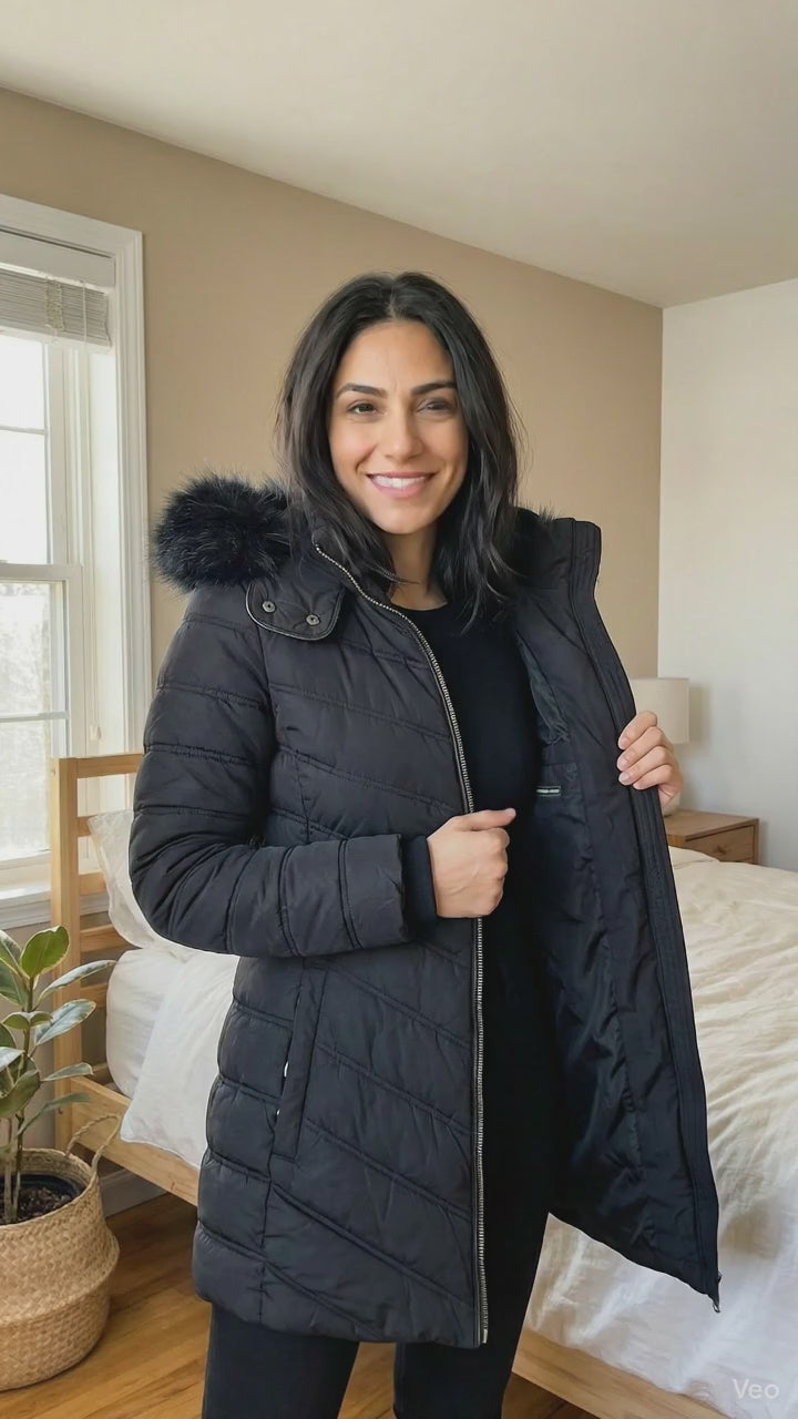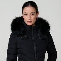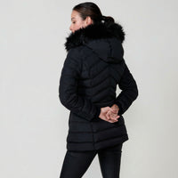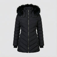 La capucha con borde de pelo sintético añade un toque de lujo y calidez, creando un marco elegante alrededor del rostro y protegiendo eficazmente del viento y el frío. El cuello alto y el cierre de cremallera completan un diseño pensado para maximizar la sensación de abrigo sin perder la estética urbana y sofisticada.