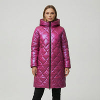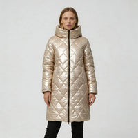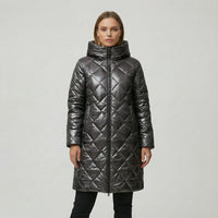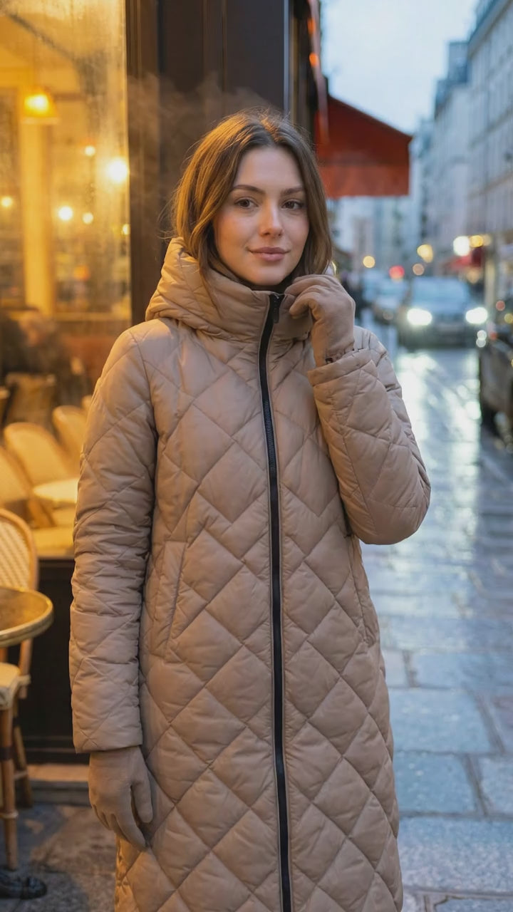 El diseño presenta un patrón de acolchado en forma de rombos que aporta textura y un efecto visual estilizado. Su capucha amplia enmarca el rostro con armonía, brindando mayor calidez sin añadir volumen innecesario. Cada costura está pensada para equilibrar movilidad y elegancia, logrando un abrigo que no solo protege, sino que realza tu presencia con un toque moderno y minimalista.
