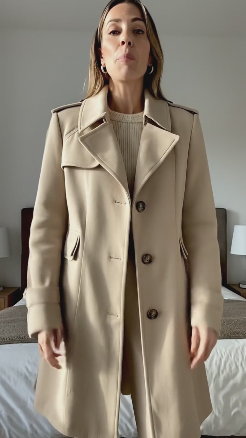 El abrigo presenta solapas amplias, hombros con ligero volumen y un corte entallado que acentúa la cintura, creando una silueta estilizada y femenina. Sus botones frontales de acabado tipo carey añaden un toque distintivo y elegante, mientras que los puños con correas ajustables refuerzan su estética clásica y funcional.