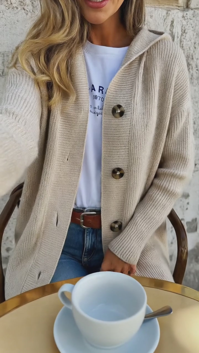 La capucha amplia y los botones frontales aportan un toque informal y práctico, mientras que el tejido de punto suave envuelve el cuerpo con calidez sin añadir peso. Su diseño atemporal permite llevarlo con jeans, camisetas básicas o vestidos, adaptándose a cualquier ocasión con naturalidad.