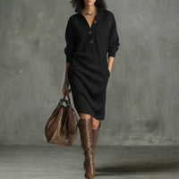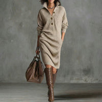 Este vestido de punto combina elegancia relajada y comodidad absoluta en una sola pieza, convirtiéndose en un imprescindible para looks sofisticados sin esfuerzo. Su silueta recta y fluida envuelve el cuerpo con suavidad, ofreciendo un ajuste cómodo que se adapta a cualquier ocasión, desde un paseo por la ciudad hasta una reunión informal. El tejido grueso y cálido lo convierte en la opción ideal para los días más fríos sin renunciar al estilo.