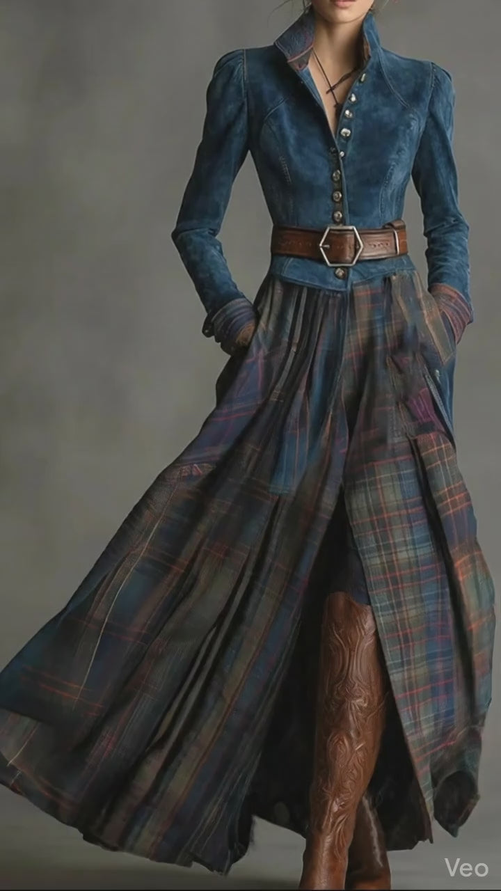 La falda larga con estampado de cuadros añade movimiento y profundidad visual, creando un contraste armonioso con el cuerpo del vestido. La cintura se define con un cinturón ajustable que estiliza la figura y aporta un toque artesanal al diseño. Su caída fluida y su estructura equilibrada lo convierten en una pieza cómoda y muy favorecedora.