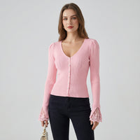 Este top de punto combina elegancia, feminidad y un diseño cuidadosamente trabajado para realzar la figura. Su tejido acanalado estiliza visualmente el torso, mientras que el escote en V aporta un toque sofisticado y favorecedor. Los botones frontales añaden detalle sin recargar la prenda, manteniendo una estética limpia y moderna que se adapta a infinidad de looks.