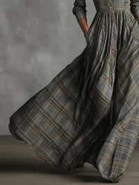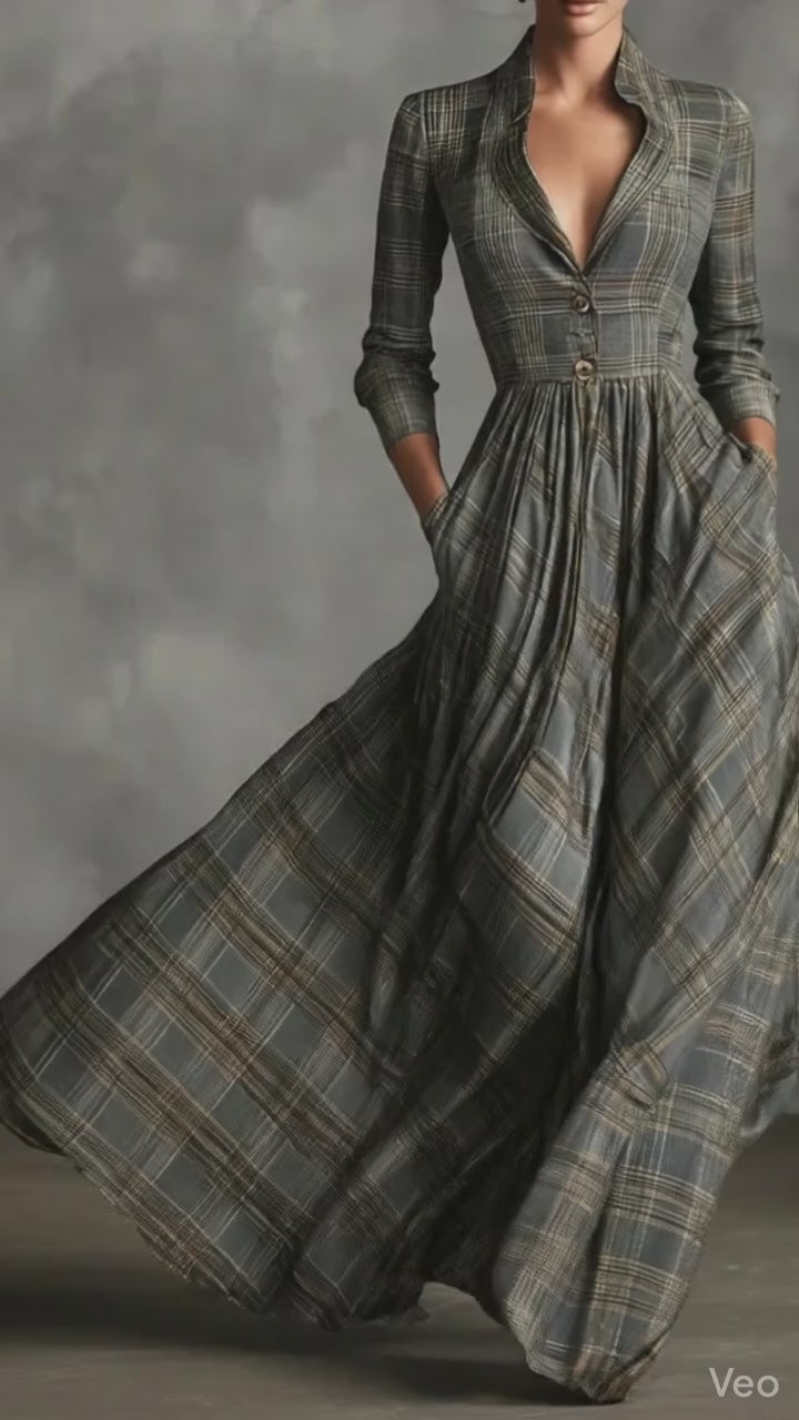 Este vestido largo de estilo clásico renovado destaca por su elegancia atemporal y su silueta femenina. El diseño con escote en V profundo y botones frontales aporta un toque sofisticado y sensual, mientras que el patrón de cuadros le da carácter y personalidad. Es una prenda ideal para quienes buscan un look refinado con inspiración vintage.