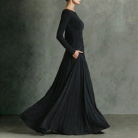 Este vestido largo negro destaca por su silueta sofisticada y su caída fluida que acompaña cada movimiento con elegancia. El diseño de manga larga y escote barco aporta un equilibrio perfecto entre sensualidad y refinamiento, convirtiéndolo en una pieza atemporal imprescindible en cualquier armario femenino.