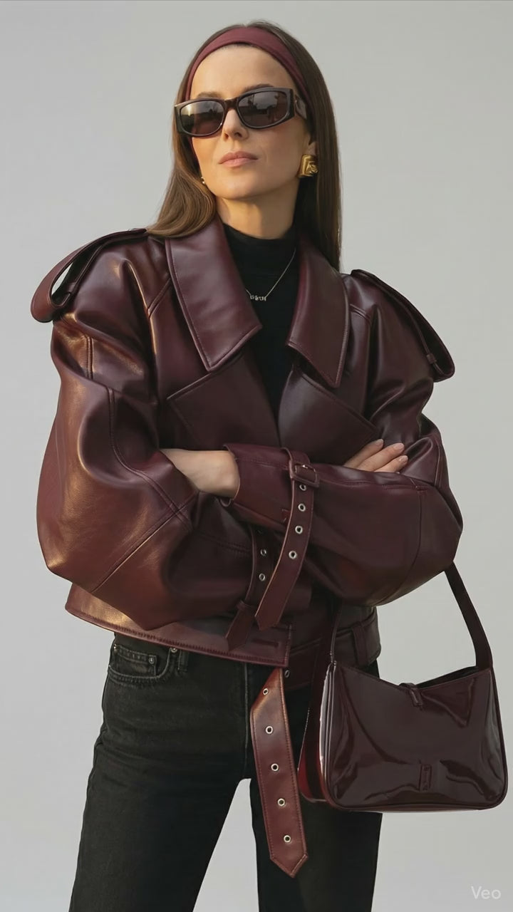 Descubre la elegancia atemporal de nuestra chaqueta premium de piel vegana en tono burdeos, una pieza diseñada para elevar cualquier conjunto con una presencia sofisticada y moderna. Su silueta estructurada, los amplios hombros y los detalles tipo trench la convierten en una prenda protagonista que combina estilo urbano con un toque de alta costura. Ideal para cenas, eventos y ocasiones donde quieras destacar con un look pulido y distintivo.