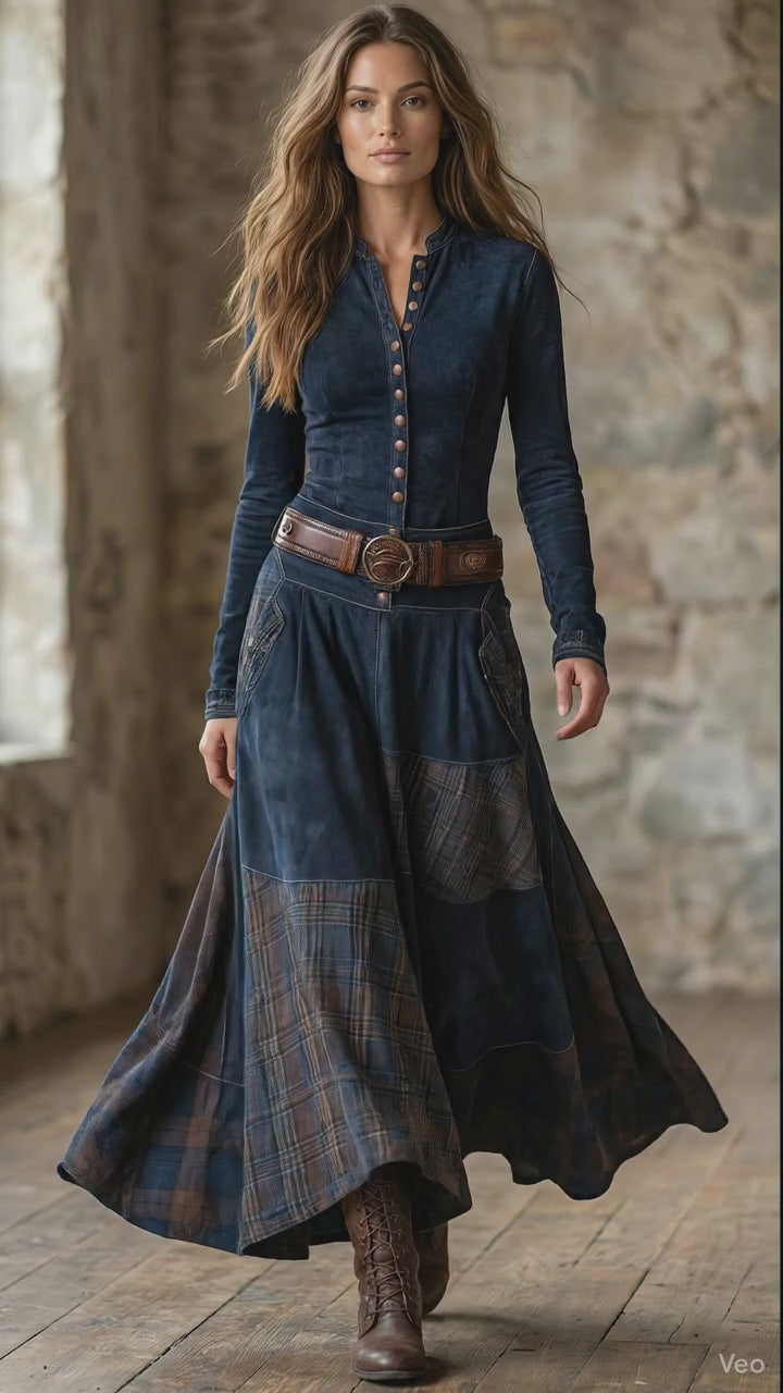 LEONORA™ | Vestido largo de ante a cuadros azul marino (incluye cinturón)