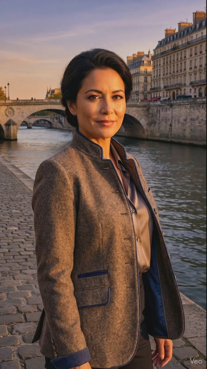 Esta chaqueta de estilo sastre combina elegancia clásica con un toque contemporáneo. Su corte entallado realza la figura con precisión, mientras que los detalles en azul marino aportan un contraste sofisticado que eleva el diseño. El cuello alto estructurado y los botones metálicos crean una estética pulida y refinada, ideal para quienes buscan una prenda versátil y con carácter.