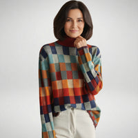 Este suéter de cuadros multicolor combina un diseño vibrante con una estética cálida y acogedora, ideal para quienes buscan destacar con estilo durante los meses fríos. Su paleta de colores —que incluye tonos naranja, azul, verde menta y beige— crea un patrón armónico y moderno que aporta frescura a cualquier outfit. El cuello alto añade un toque adicional de calidez, aportando además un aire sofisticado y pulido.